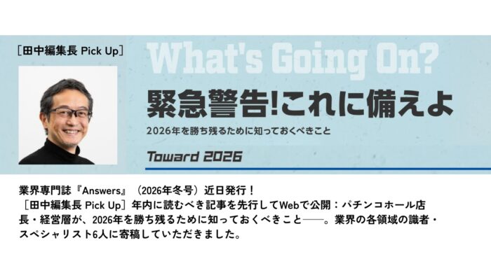 業界専門誌『Answers』(2026年冬号)より、年内に読むべき記事を先行してWebで公開:パチンコホール店長・経営層が、2026年を勝ち残るために知っておくべきこと──。パチンコ業界の各領域の識者