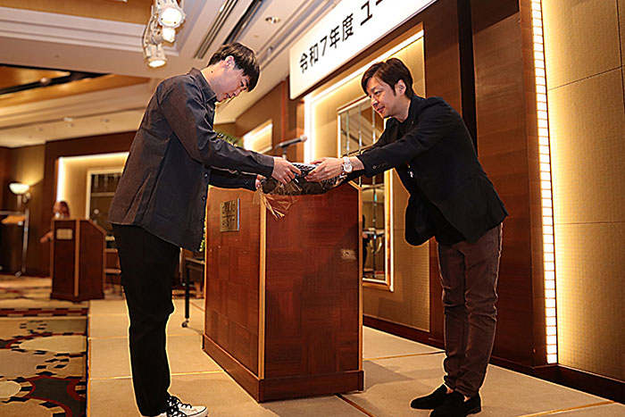 久保本部長より新入社員一人一人に事例と制服が手渡された。
