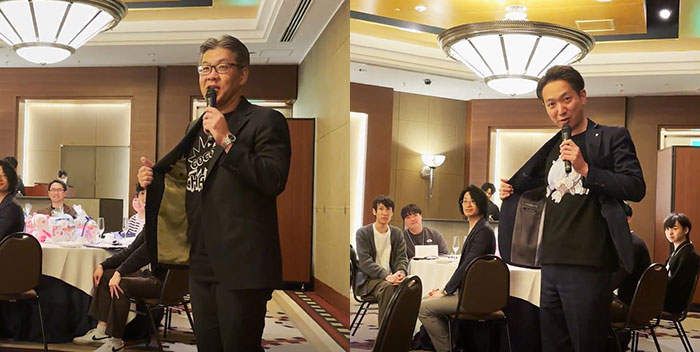 金海社長をはじめ役員も同様に私服スタイルにて参加。ジャケットの下にはパチンコ・パチスロにまつわるTシャツを着用。新入社員は笑顔と緊張が入り混じりながらも、個性を尊重する制度の意義を共有する時間となった。