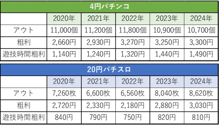 2024年の4円パチンコのアウトは10,700個。2年連続で過去最低を更新し、コロナ禍を下回る水準となった。その一方で、粗利は過去最高を更新した。20円パチスロのアウトはスマスロの登場により大幅に上昇し8,620枚。2024年の大きな変化として、20パチスロの台数シェアが35.5%に上昇し、4円パチンコの台数シェア(33.1%)を初めて上回るという逆転現象が起きた。ダイコク電機の服部氏はこれを「パチンコは収益の柱、パチスロは集客の柱という役割分担になった」と表現。