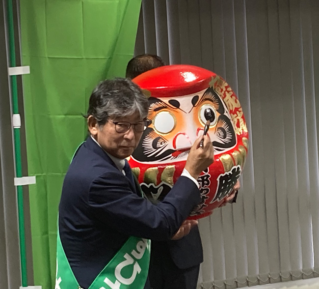 その後、だるまの目入れ式が行われ、参加者全員で阿部やすひさ候補の勝利を祈願。