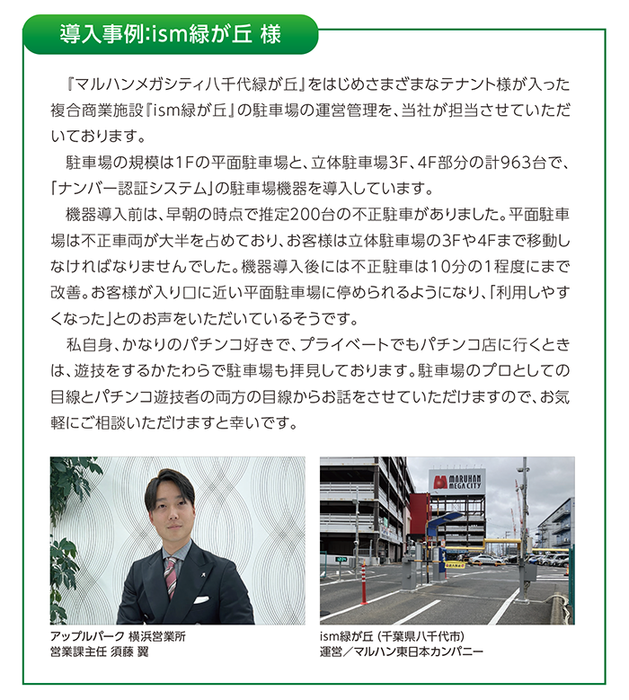 駐車場・駐輪場経営のパイオニアでもある当社・アップルパーク(東京都)は、大手スーパー、大手デパート、病院、大手コンビニエンスストアなど、首都圏を中心に全国1000カ所以上・約6万台分の駐車場・駐輪場を設置運営している実績があります。パチンコホール様は、マルハン東日本カンパニー様、株式会社ダイナム様、株式会社遊楽様といった大手法人様など約70店舗に約1万台分を設置運営しています。その実績と導入施設さまへのヒアリングから、機械化のメリットを以下のように捉えています。