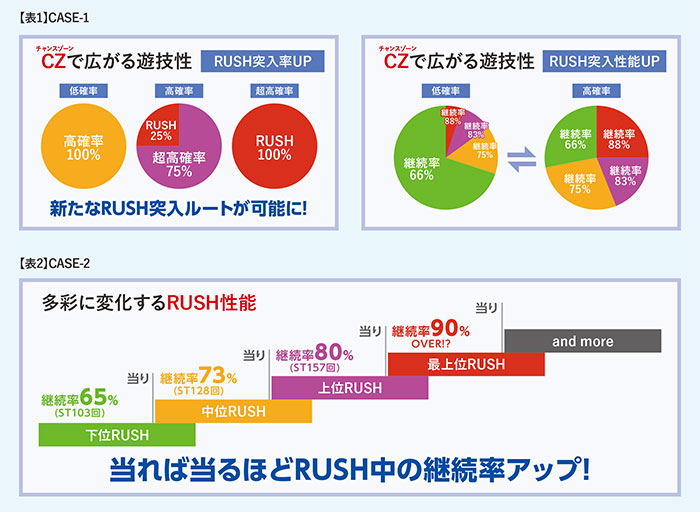 例えば、大当たりするごとにRUSH中の継続率を徐々にアップさせるだけでなく、同じく開放パターンを変えることで、継続率は変えないまま大当たり出玉自体を「1,000個→2,000個→3,000個」とアップしていくものも考えられる。またRUSH性能だけでなく、大当たりするごとにST機とループ機の性能が入れ替わるなど多種多様のゲーム性にも期待できる。