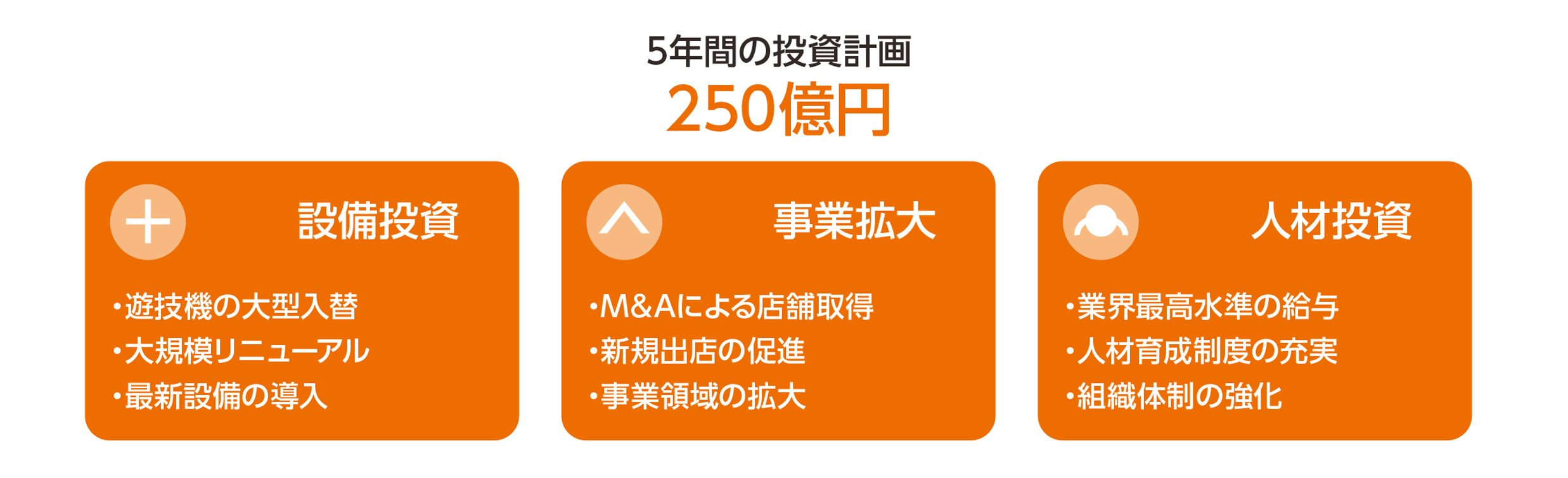 事業の規模感をお話しすると、例えば、パチンコ店を1,000台規模で出店する場合、約50億円の投資が必要です。新規事業を展開する場合でも、このような規模感でバランスの取れる事業展開を視野に入れ、準備を着実に進めているところです。今後、3年以内の実現を目指していますが、早い段階での展開も検討しています。内部人材と外部人材の融合によって、新しい発想や考え方を生み出していけると考えていますが、お互いの良さを活かし合える環境づくりが、成長への近道だと確信しているのです。