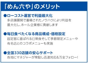 さらに、お客様に飽きることなく繰り返し足を運んでいただくため、季節の限定商品や有名店とのコラボメニューを導入し、満足度を一層高めています。リピーターの増加はホール全体の安定した集客に貢献し、店舗の活性化にもつながっています。これからも『めん六や』は、お客様の食卓を豊かに彩る存在であり続けます。