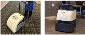 〔左〕カーペットスイーパーなどを積極的に導入し、清掃業務の効率化を常に意識。目指すのは「簡単」「早い」「キレイ」。〔右〕ホール清掃もロボット化が進んでいます。写真はソフトバンクロボティクス社のAI清掃ロボットWhiz (ウィズ)。