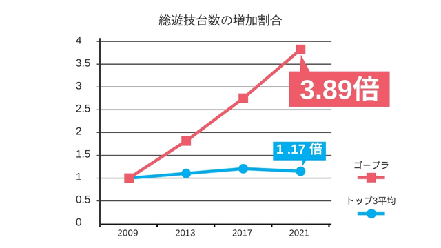 当社の総遊技台数は過去12年間で3.89倍に拡大。注目すべきは、業界上位3社(M社、D社、G社)の同期間における拡大率が1.17倍という実績の中で、当社が約4倍近い拡大を達成したという点です。業界リーディングカンパニーと比較しても、圧倒的な成長スピードを実現しています。