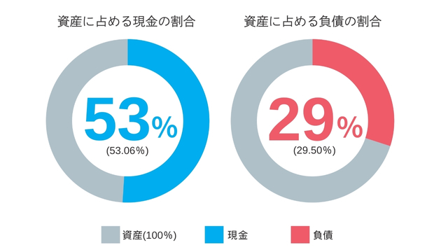 総資産に占める現金比率は53.06%と、負債比率29.50%を大きく上回る水準を維持しています。手元資金により、企業活動に伴う負債を全てキャッシュ・フローで賄える財務構造を確立。取引先への支払いも現金決済を原則とし、堅実かつ健全な経営基盤を構築しています。
