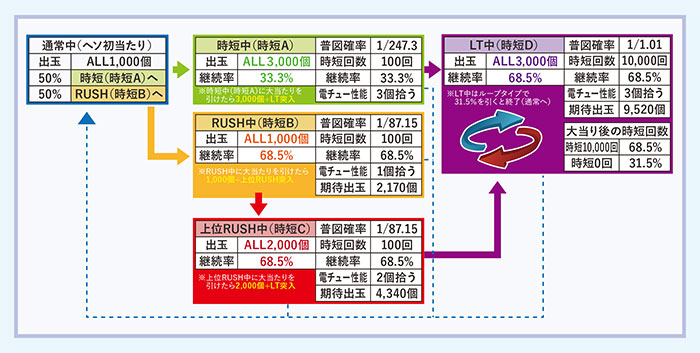 しかし、ここで時短性能に目を向けると、「時短(時短A)」中に大当たりした場合は、電チューが玉3個を一気に拾うロング開放(1,000個×3=3,000個大当たり)となるばかりでなく、その大当たり後は「LT」へ直接移行する。一方「RUSH(時短B)」中の大当たりは、電チューが1個しか拾わないショート開放であり大当たり出玉は1,000個のみ。しかも大当たり後は「上位RUSH(時短C)」へは移行するものの、LTには移行しない。