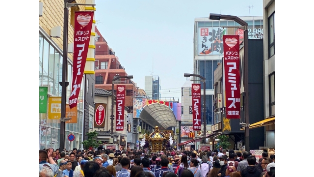 グランドオープン時におこなった入場整理券の配布は、既存会員から開始。貯玉もそのまま利用できるようにしたほか、販促施策では、会員情報を活用してスマートフォンや携帯電話に「ダイレクトメッセージ(DM)」を送付している。Webメディアではリーチできないターゲット層にアプローチできるDMのメリットを活かして、スリープ層や離反層の誘引も積極的に実施。浅草が1年でもっとも盛り上がる三社祭(さんじゃまつり)では、浅草六区ブロードウェイ商店街をエリアジャックする大々的なプロモーションで認知拡大を図った。また、外国人観光客が増加していることから、同店オリジナルの英語・中国語・韓国語対応の遊技マニュアルの配布や外貨両替機も設置。接客する際には、AI通訳機「ポケトーク」を活用するなど、インバウンド集客を想定したオペレーションも整えている。