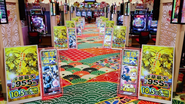 アミューズグループの株式会社DAYブレイクが運営する『アミューズ浅草店』は東京都台東区「BIGPANDORA浅草店本館(855台)」の居抜きで、2024年4月26日に台東区エリア最大規模となる総台数955台でグランドオープン。これにより、関東圏におけるアミューズブランドは2店舗目。東京は初出店であったが、3週連続稼働率全国1位(エンタープライズ集計)を獲得するなど大成功だったといえるだろう。