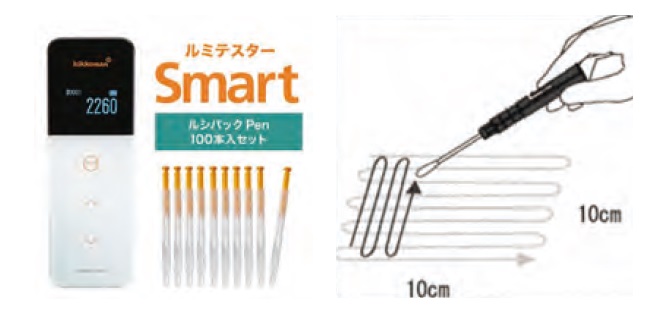 当社は、キッコーマンバイオケミファ社の『ルミテスター』を使用し、ATPふき取り検査(生き物を含む多くの有機物に含まれるATP=アデノシン三リン酸を汚れの指標として計測する検査)による「汚れ度合いの数値化」を実施しています。