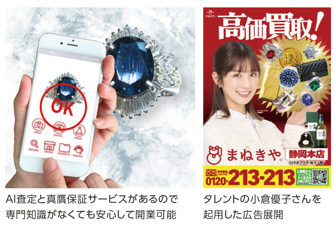 「まねきや」は、開業前の物件選定から、査定や接客スキルを習得する研修プログラムの提供はもちろんのこと、開業後はタレントを起用した全国規模の広告展開によって本部が集客を全面的にバックアップします。また、一度に大量の貴金属や宝石が持ち込まれた際など高額商品の買取で資金が不足する際には、本部が買取資金を事前に入金する制度がありますから、FCオーナー様は機会損失を防ぐことができます。