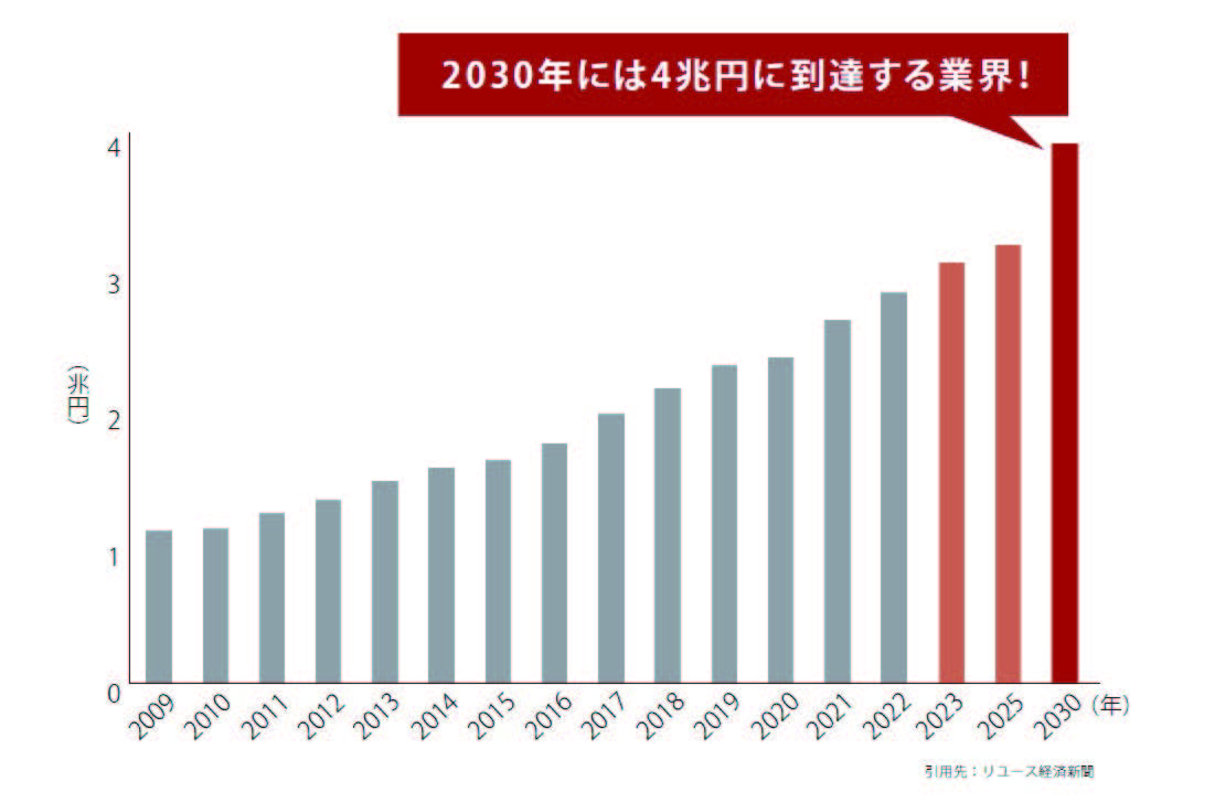 こうした課題に対する有効な解決策の一つとして、現在急速な成長を遂げている「リユース事業」が挙げられます。リユース市場は2 0 2 3 年に3 兆円規模に達し、2030年には4兆円へと拡大することが予測されています。特に、買取専門店は在庫を抱えるリスクがなく、省スペースかつ少人数で運営できるため、新規参入のハードルが低いビジネスモデルとして注目されています。