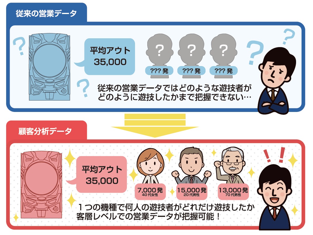 ホールコンピュータのデータは、稼働・売上・粗利を軸に遊技機性能に特化しています。仮に、自動車業界に置き換えると、出荷台数・売上・粗利と車のトルクや最高スピードなど車性能を見ていることに相当します。また、パチンコ業界の頭取りデータについては、店舗・機種毎の集客人数だけのデータに過ぎず、「どのような人がどの程度遊技しているのか」までは把握していないのが現状です。業界が活況な時はそれで良かったのも事実ですが、市場規模・遊技人口が減少に転じている状況下では、「どのような客層がどのような使い方をしているのか」などの顧客のニーズを知ってそれに添った営業手法を模索し実践する、「マーケットイン」と言われるアプローチが異業種では常識となっています。