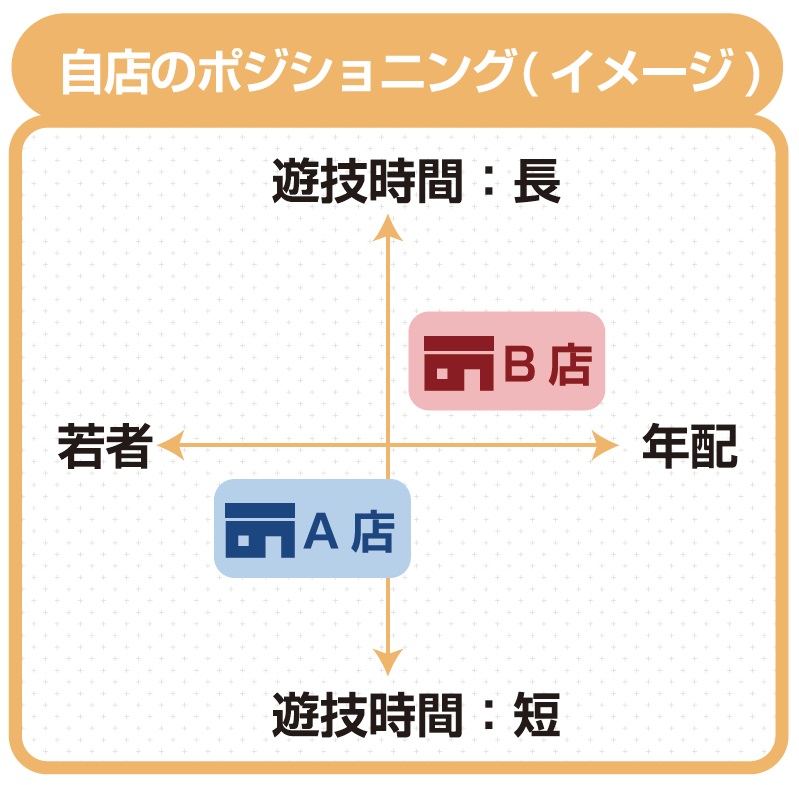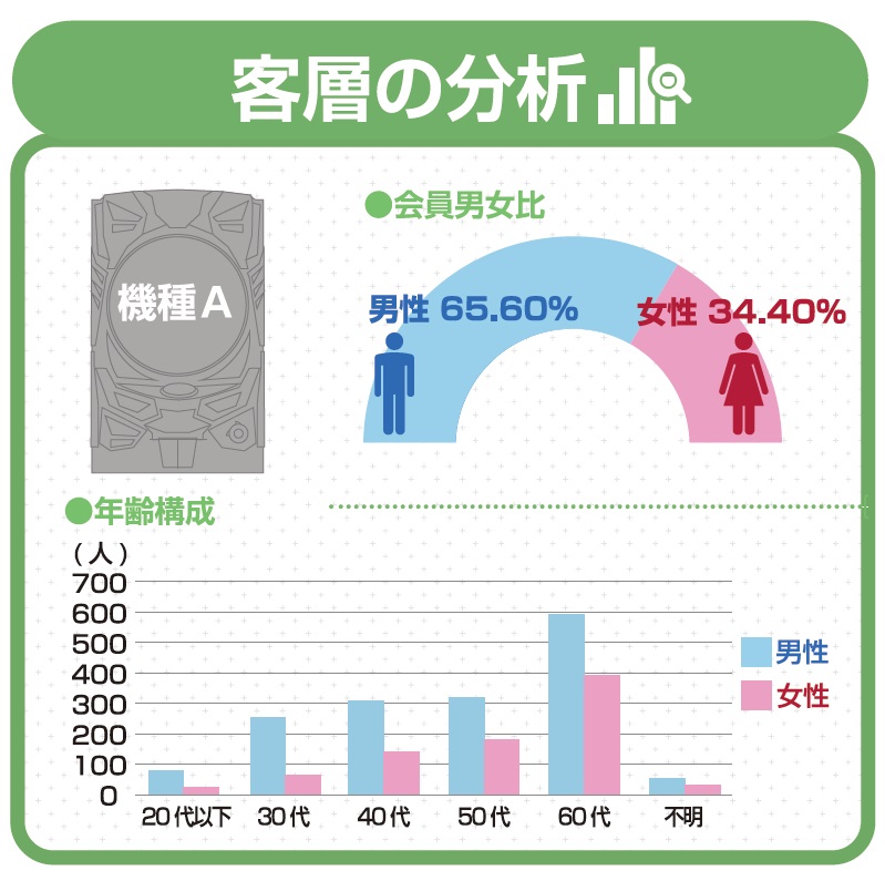 機種ごとにお客様の構成がわかるということは、自店舗のお客様の層や特徴の把握ができ、当然全国のデータと比較することも出来ますので、自店のポジショニングを知ることも可能となります。例えば、下記のようなケースです。