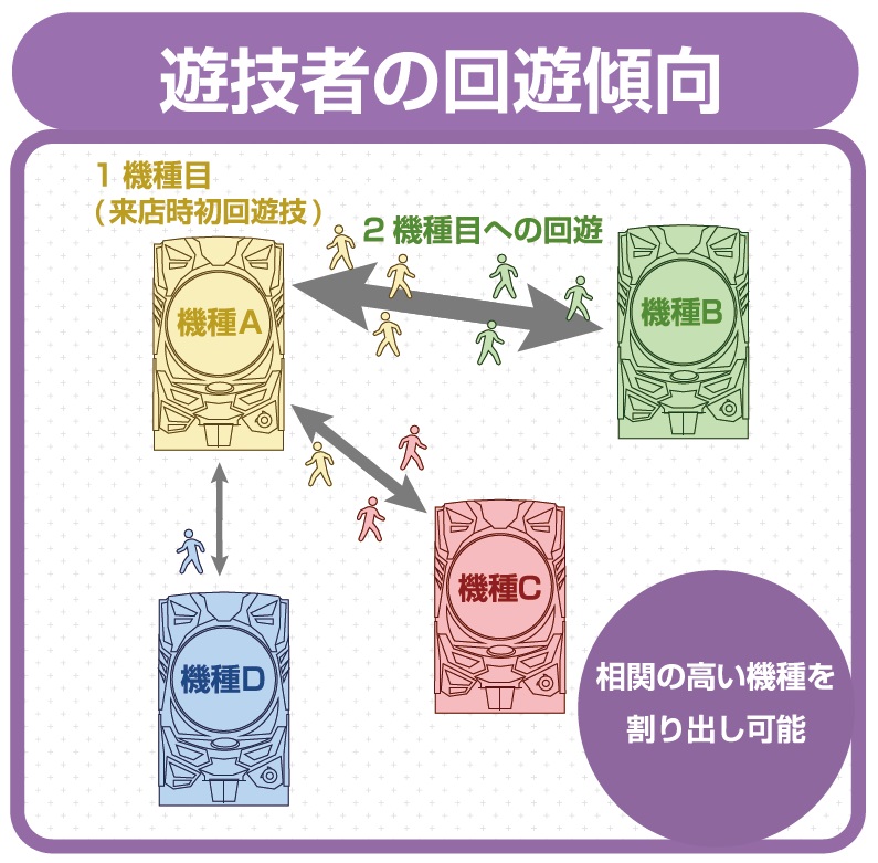 対象の機種を軸として、お客様がどの台と行き来しているか相関関係(傾向)をみることができます。回遊している機種がわかれば、店内の最適なレイアウト(遊技機の配置)の構想にも活用できます。また、台入替の際にもお客様の好む要素を把握することにより、精度の高い導入・撤去台の選択が可能になります。さらに遊技客の遊技履歴を把握することで、来店して一番初めに遊技している台の確認をすると、〈初遊技率の高い台=その台を目的に来店している〉機種がわかり、リピート化・固定化施策として重要な指標となります。