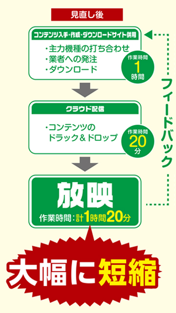 その結果が図の下記のフローです(ここには労務の課題となっていたポスター掲示作業からのサイネージへの転換分も含まれております)。この効果は全社で認められ、全店でシステムの導入が図られました。