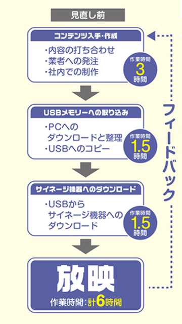 サイネージの運用にかかっている1週間の労務時間6時間を、3分の1以下にするために次の対策が取られることになりました。