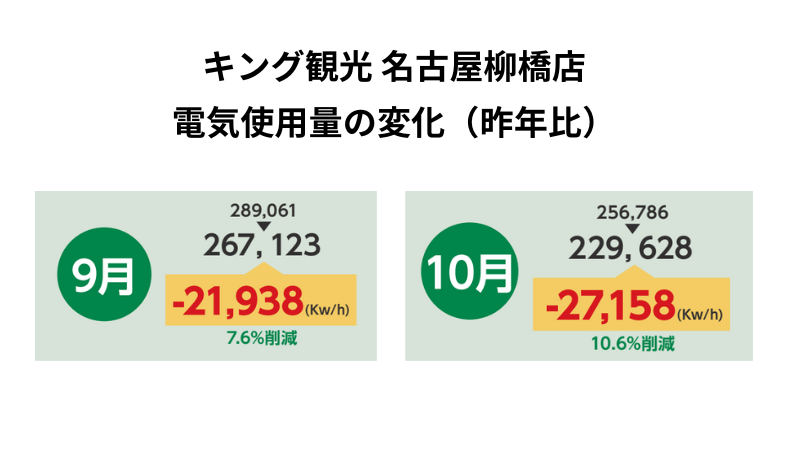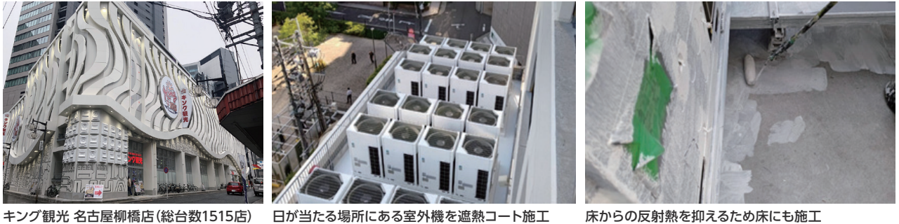 『キング観光名古屋柳橋店』の室外機は、周囲のビルへの配慮を重視して決められた結果、直射日光が当たる場所にズラリと配置されています。現地調査の結果、この室外機本体と設置個所を『トライブコート』でコーティングすることで冷房効率が高まるというシミュレーションを提示していただきました。施工は今年のGWだったので、この夏の電気使用量は前年比で大きな削減効果が得られています。