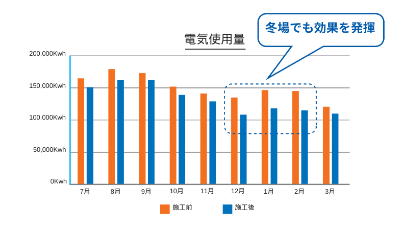 そもそも建物の壁には、「夏季には外部からの熱を遮断し、室内の冷房効果を高めることでエアコンの稼働時間を短縮する」「冬季には室内の熱を逃がさないことで暖房効果を保持し、暖房の稼働時間を短縮する」という役目がある。しかし、店舗のガラス壁、ガラス窓、室外機などは、〈遮熱〉の対策が手薄だ。ここに遮熱・断熱コートを施すことで、電力使用量の削減効果が期待できる。遮熱・断熱コート『トライブコート』の場合、夏は暑さの光熱である近赤外線を遮蔽し窓から入る直射熱の8度から15度を遮ることができ、冬は室内から暖房熱エネルギーの流出を抑制し2度から3度上がる。また、結露防止の効果もある。