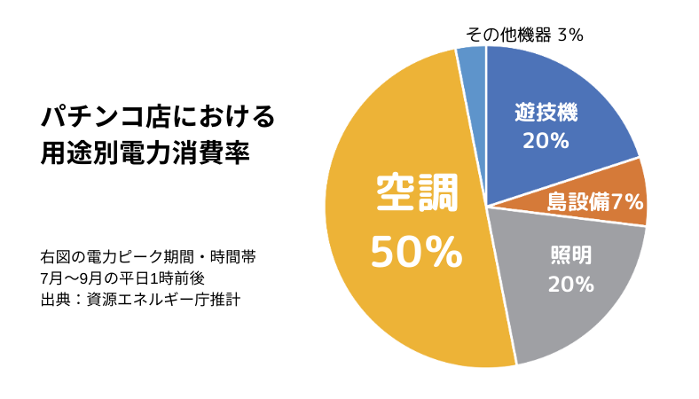 では、パチンコホールの場合、電力の多くはどこに使われているのか。図の通りで、電力のおよそ半分が空調に使われている。そして20%が照明、20%が遊技機、7%が島設備に消費されている。つまり、空調機器を効率よく利用することが、もっとも大きな電力削減効果を期待できるのだ。その代表的な方法は、消費電力が低い空調設備に交換することだが、これは非常にコストがかかるし、近年オープンしたホールの空調設備はすでに省電力タイプのものだ。それ以外の場所で、電力削減効果を期待できる部分を探す必要がある。