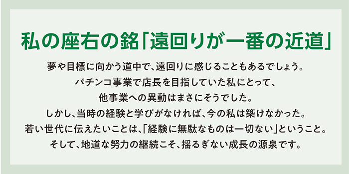 この経験を通じて、「お客様に喜んでいただくこと」という商売の原点に改めて気づかされ、深く考えるようになりました。その一方で、パチンコ事業の現場を離れていたからこそ、資金や売上の大きいパチンコ事業のダイナミックさを再認識しました。飲食事業での経験は、私の視野を広げ、多角的な視点から物事を捉える力を養ってくれたと実感しています。