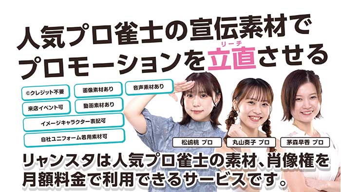 そこで生まれたのが「リャンスタ」です。パチンコホールにとっては、プロ雀士の肖像権を活用した独自のクリエイティブ展開ができ、また、プロ雀士にとっては、新たな収入源と活躍の場が広がる可能性があります。パチンコホールでの露出により、雀士自身の認知度向上にも繋がる可能性もあるのではないでしょうか。