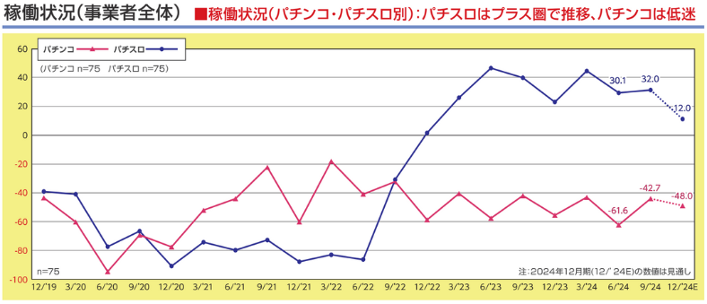 パチンコは▲42.7ポイントと依然マイナス圏だが前回比18.9ポイント増と改善傾向にある。一方、パチスロは32.0ポイントとプラス圏を維持している。
