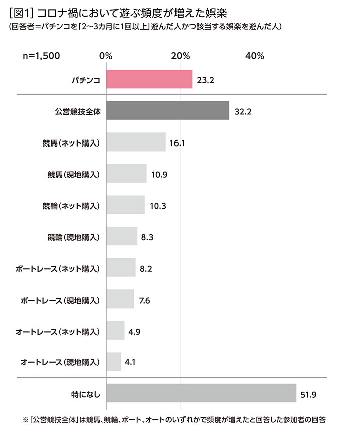 現在のパチンコ遊技者(「2~3カ月に1回以上」の頻度でパチンコを遊んでいる人)の半数は、コロナ禍においてパチンコを遊ぶ頻度に変化がなく、頻度が増えた人は23.2%だった(図1参照)。公営競技をひとつの「公営競技全体」という種目と捉えて、競馬、競輪、ボート、オートのいずれかの種目で頻度が増えたと回答した人の割合を算出すると33.2%で、パチンコを上回った。