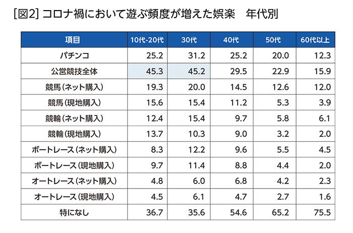 これを年代別に見ると、10代・20代層および30代層では、「公営競技全体」を遊ぶ頻度が増えた人が45%と、他の年代を大きく上回っている(図2)。