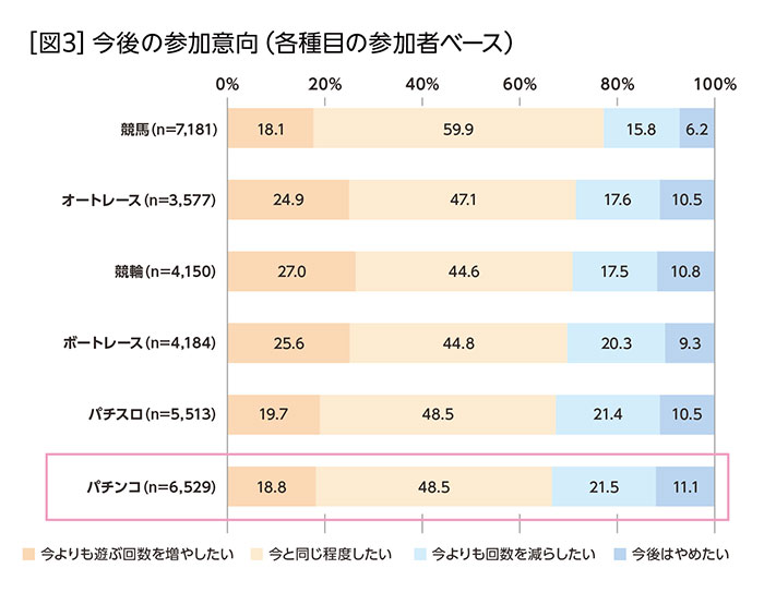 調査対象種目の中で、それぞれの参加者(過去1年間にその種目を遊んだことがる人)に今後の参加意向を尋ねている。いずれの種目も「今と同じ程度したい」という回答が最も多い。「今よりも遊ぶ回数を増やしたい」の回答率に着目すると、最も高いのは競輪参加者で27.0%。次いでボートレース参加者、オートレース参加者だった(図3)