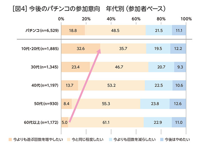 パチンコ参加者における「今よりも遊ぶ回数を増やしたい」の回答率は18.8%。ただし、年代で大きな差異があり、若年層ほどその意向者の割合が高い(図4)。