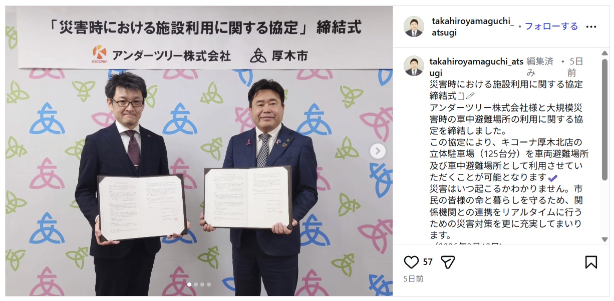 本協定は、地震や風水害などの災害発生時、市民の生命や財産を守ることを目的としている。アンダーツリーは、同市内で運営する「キコーナ厚木北店」(厚木市三田)の併設立体駐車場の一部を、車両の一時避難および車中避難場所として提供する。