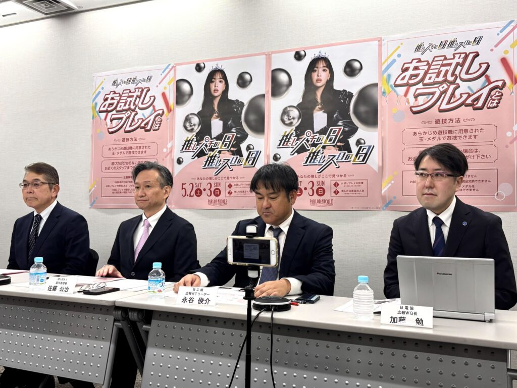 パチンコ・パチスロ産業「推しの日」委員会は3月31日、都内で記者会見を行い、会見に登壇した全日遊連の合田康広副理事長は、「広告宣伝検討会で長期にわたり議論を重ね、ようやくプレテスト実施に漕ぎ着けた。1店舗でも多くのホールに参加いただき、告知を大々的に行える環境を作りたい」と、業界一丸となった取り組みであることを強調した。