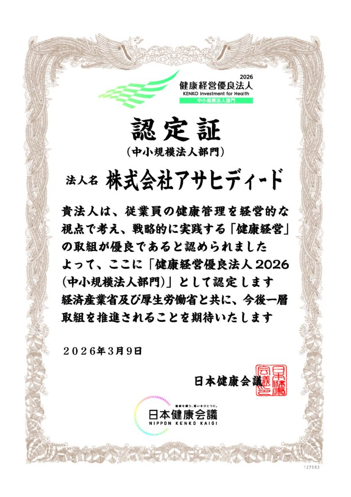 大阪府を中心にパチンコホール「イルサローネ」などを展開するアサヒディード(大阪市)は4月7日、経済産業省と日本健康会議が共同で実施する「健康経営優良法人2026(中小規模法人部門)」において、3年連続の認定を受けたことを発表した。