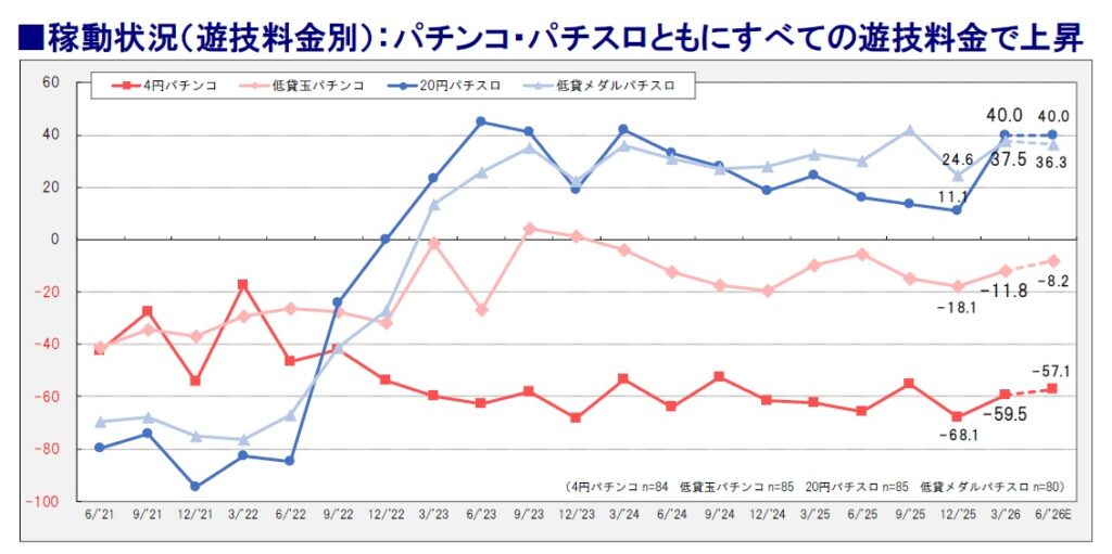稼動状況を遊技料金別で見ると、パチンコとパチスロで明暗が分かれる結果となった。