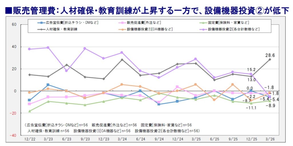 今後3カ月間の販売管理費の支出見込みにおいて、「人材確保・教育訓練」は28.6ポイント(前回比15.6上昇)と目立った上昇を見せた。これは新年度に伴う新入社員の受け入れによる支出増加という季節要因と考えられる。また、「設備機器投資②(各台計数機など)」は▲5.4ポイントと、3カ月間の調査から20.6ポイント低下した。これは年末に改装を済ませ、設備投資がひと段落したことの表れと考えられる。