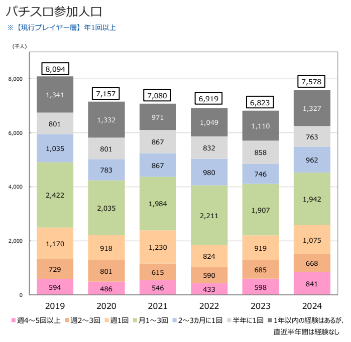 2025年1月に実施された調査によると、2024年のパチスロ参加人口(年1回以上遊技)は約757万8千人となり、前年比で約76万人増加した。2023年の682万3千人から回復しているものの、コロナ禍前の2019年の809万4千人には及んでいない。
