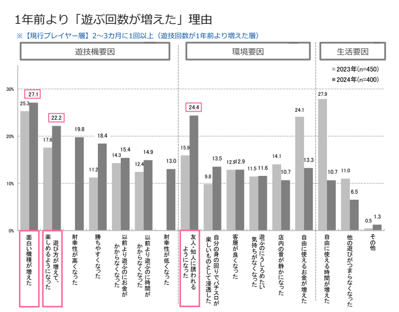 「参加頻度が2~3ヶ月に1回以上」で「遊技回数が1年前より増えた」層を対象に、参加頻度が増えた理由を尋ねたろころ、「面白い機種が増えた」(27.1%)が最も高く、続いて「友人・知人に誘われるようになった」(24.4%)、「遊び方が増えて楽しめるようになった」(22.2%)の順で高かった。特に「面白い機種が増えた」との回答は20円AT/ARTやスマスロを理解しているプレイヤー層で高かった。