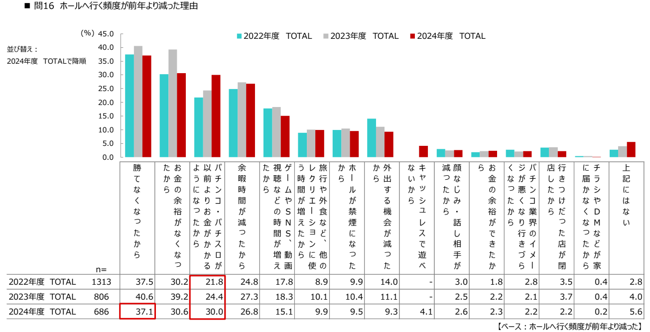 頻度が減った理由は2年連続で「勝てなくなったから」が最も高く、「お金の余裕がなくなったから」が続いている。「パチンコ・パチスロが以前よりもお金がかかるようになったから」という回答は3年連続で割合が増加している。