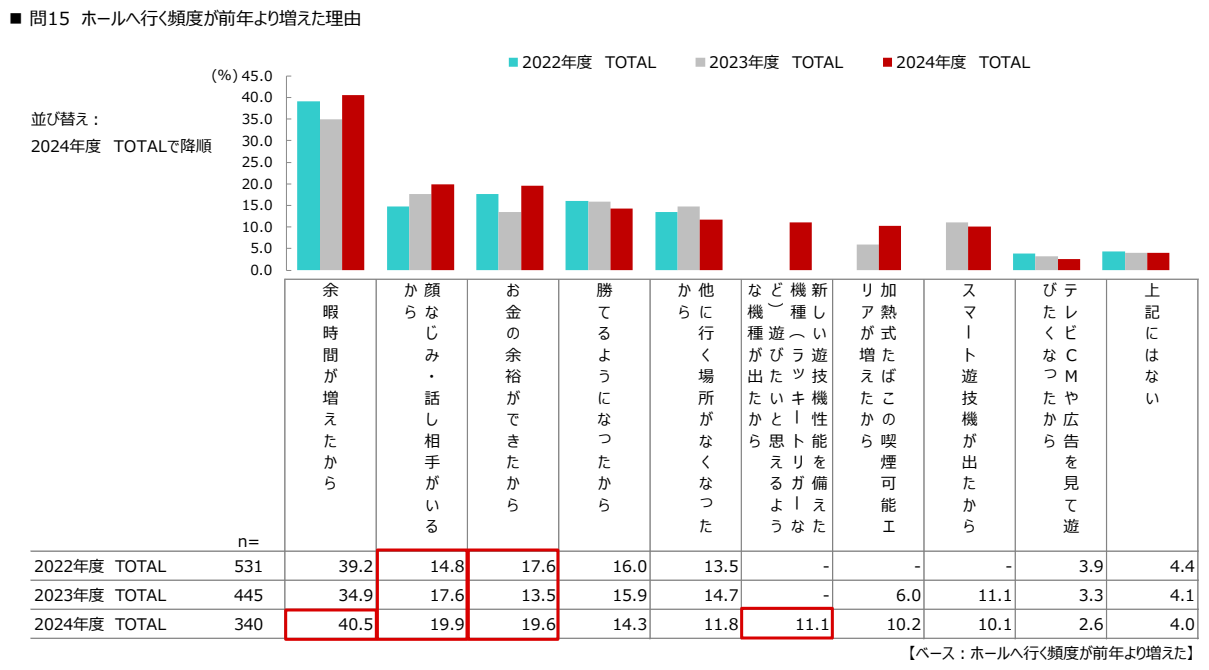 一方、頻度が増えた理由は、2年連続で「余暇時間が増えたから」が最も高く、「顔なじみ・話し相手がいるから」が続いている。「顔なじみ・話し相手がいるから」という回答は3年連続で割合が増加している点が特徴的だ。