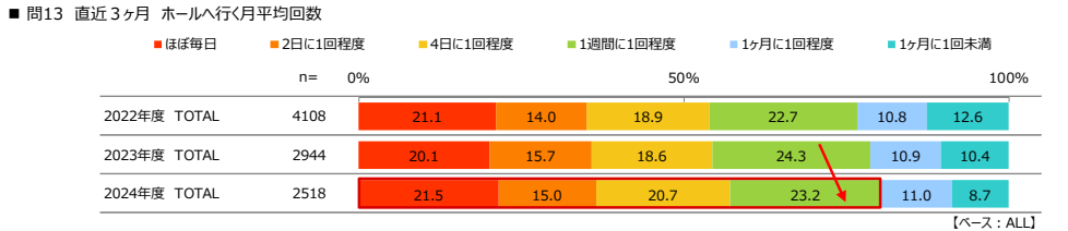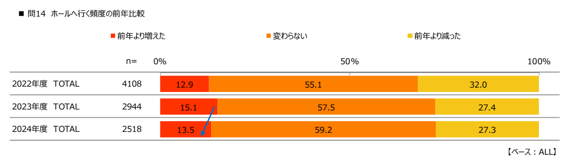 「前年より頻度が増えた」人の割合が微減し13.5%だった。その一方で「前年より減った」人の割合は前年と同水準の27.3%と頻度減少層が超過している。