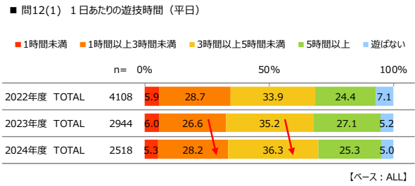 また、平日は「1時間以上3時間未満」から「3時間以上5時間未満」、休日は「5時間以上」の層が僅かに増加した。