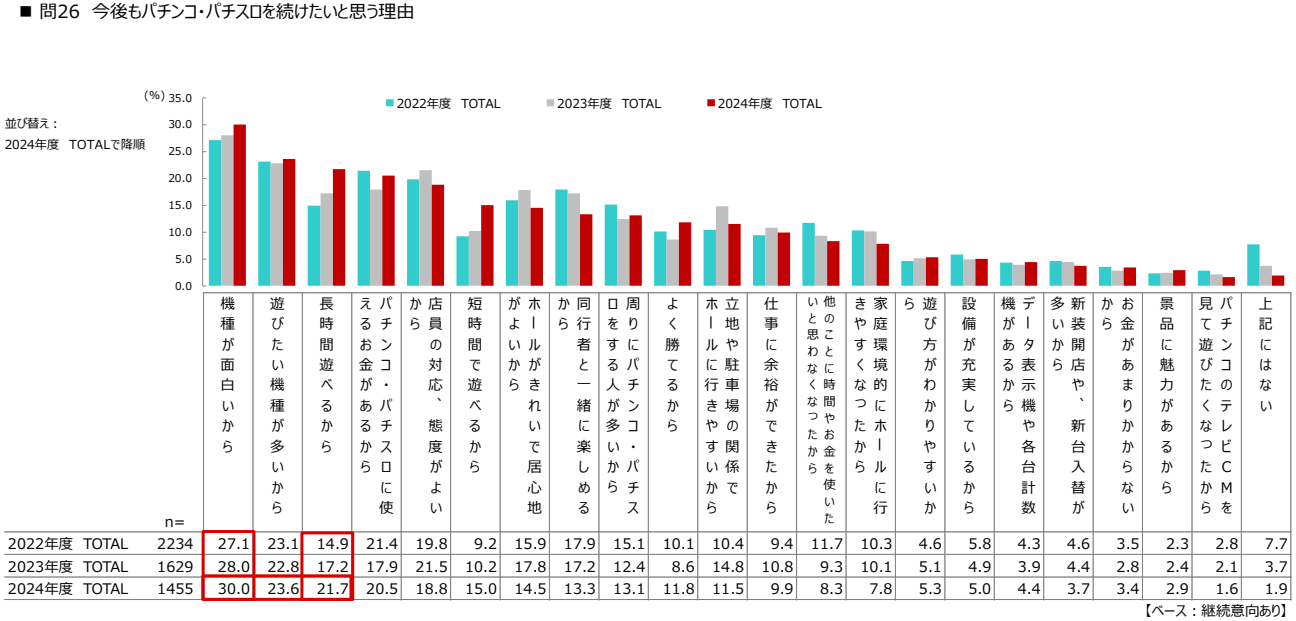 継続意向の理由としては、3年連続で「機種が面白いから」「遊びたい機種が多いから」が上位を占めており、遊技機の面白さが遊技のモチベーションにつながっていることが見てとれる。