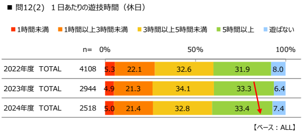 - 遊技時間:回答者の3割が1日あたり5時間以上プレイ