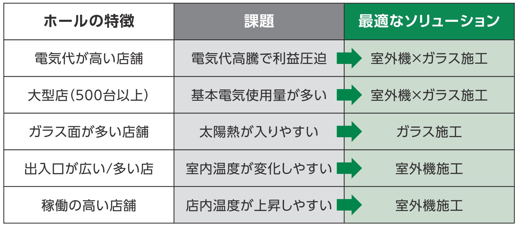 パチンコホールの場合、電力のおよそ半分が空調に使われている。そして20%が照明、20%が遊技、7%が島設備に消費されている。つまり、空調機器を効率よく利用することが、もっとも大きな電力削減効果を期待できるのだ。その代表的な方法は、消費電力が低い空調設備に交換することだが、これは非常にコストがかかるし、近年オープンしたホールの空調設備はすでに省電力タイプのものだ。それ以外の場所で、電力削減効果を期待できる部分を探す必要がある。それがガラス壁と室外機だ。