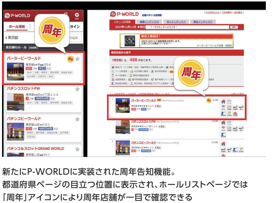 堀口部長いわく「P-WORLDはこの一年間ホールニーズとユーザーニーズに寄り添った新しい機能を多数リリースいたしました。特に周年告知が可能になったのはガイドラインが出た一昨年であり、ユーザーもまだまだ近隣店の周年を認知していないので、しっかり告知をすることで伸びしろがあると思います。また、テキスト告知は都道府県のグループ店で施策日に掲載ジャックをするのもインパクトが有りおすすめです。今後は取材・来店情報もPRできるようになっていくので、一広ケーアンドエーでは代理店として、ホールで役立つ情報を発信し続けていきます。」