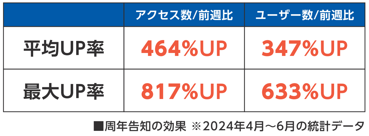 周年告知機能は7日プランと1か月プランから選ぶことができる。特に評価されているのがアクセス数だ。トップページからリンクする「周年記念店一覧ぺージ」と、各都道府県のトップページの自店名の箇所へ目立つ形で周年アイコンが表示されるため、一目でサイト閲覧時に確認できる。そのため、周年告知をした際の自店ページへのアクセス数は平均で通常時の約4倍、最大値では8倍のアクセスを獲得できている。集客ツールではなく、認知のためのツールとして活用されているからこそ、自店ページへのアクセス数増が大きく評価されている機能である。2024年12月は全国の36店舗で活用された。