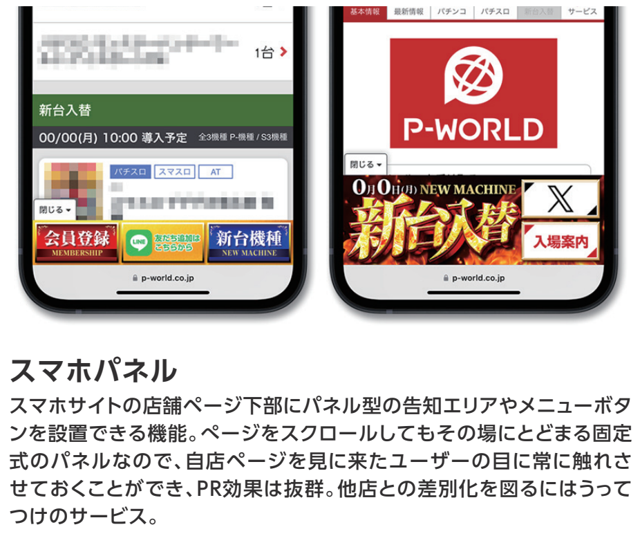 まずP-WORLDの強みは検索の優位性にある。例えば「中野区パチンコ」と検索すると絶対にP-WORLDサイトが検索トップに上がる。サイトトップから地域の検索をした際、店舗施策の一覧を見ることができるのが「ホールからのお知らせ」欄である。テキスト告知はここへ掲載される。テキスト告知は、おすすめコース利用店舗のうち約2割が毎月使用しており、有料の告知は毎月5,000回以上、無料の告知を含めると毎月24,000回以上活用されている。加えて、最上位プランの「テキスト告知ロイヤル」では、設定したテキストを「LINE広告」にも掲載可能。さらに、設定したテキストをバナー広告の形式に成型してP-WORLDのバナースペースにも表示できるため告知効果は抜群だ。